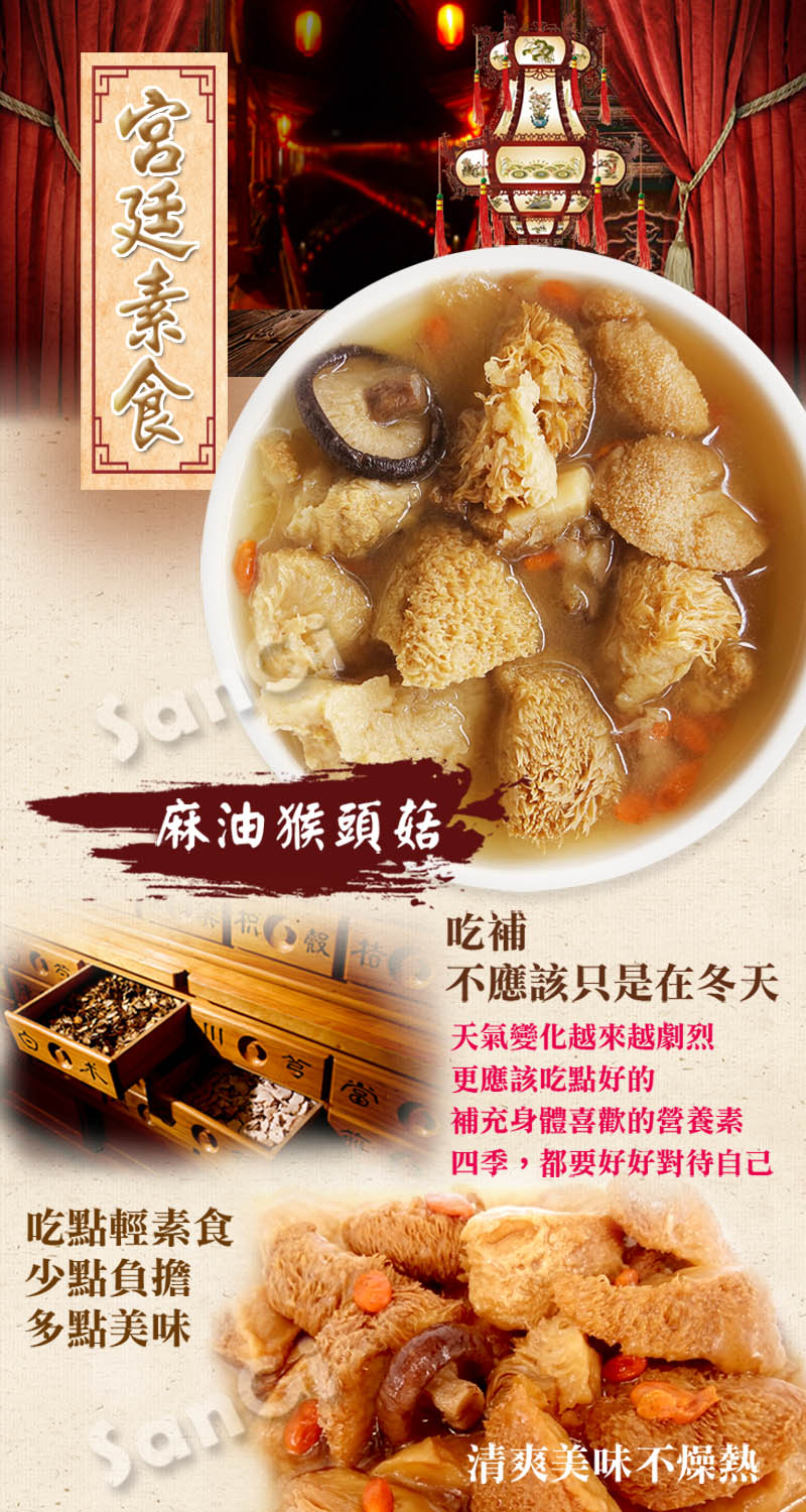 水、猴頭菇、蛋白粉、大豆油、砂糖、白麻油(芝麻 、大豆油)、薑、枸杞、食鹽、香菇、黨參、當歸、調味劑( L-麩酸鈉、5'-次黃嘌呤核苷磷酸二鈉、5'-鳥嘌呤核苷磷酸 二鈉、胺基乙酸、DL-胺基丙酸、琥珀酸二鈉) 過敏原資訊:本產品含有蛋白、芝麻、大豆及其製品,不適合其過敏體質者食用。