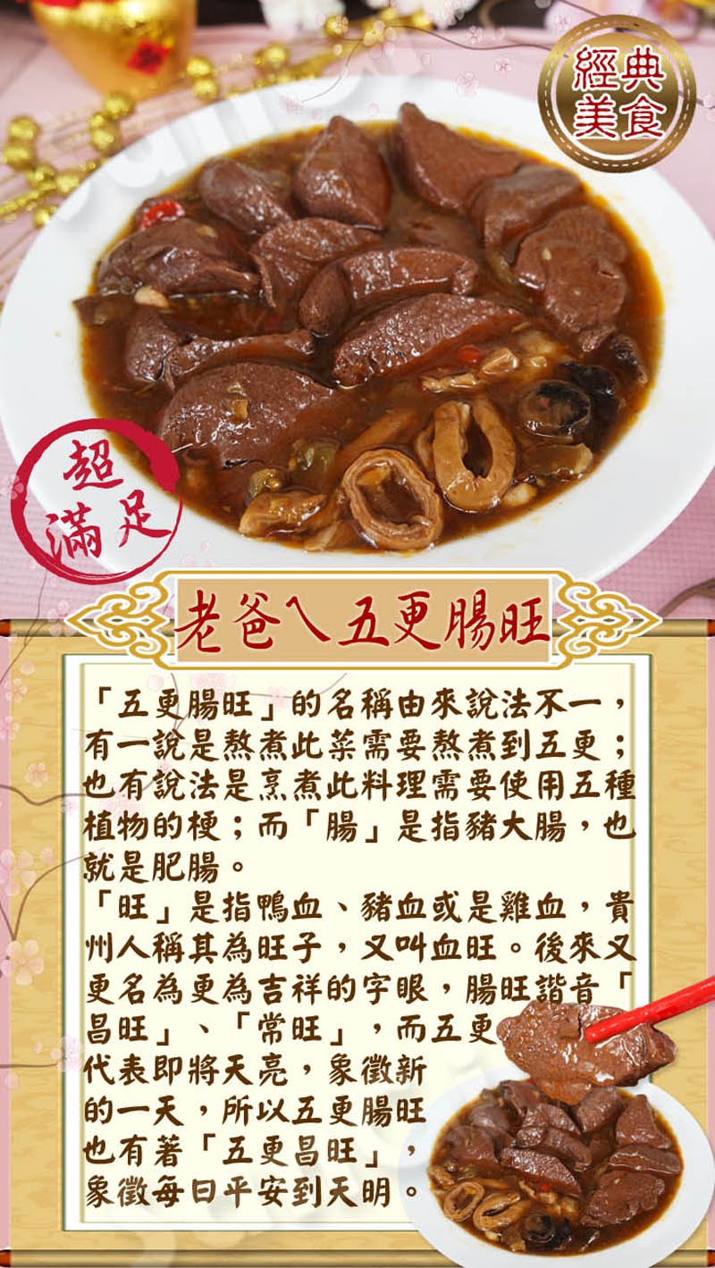 水、禽血【水、雞血、鴨血、鹽、多磷酸鈉、酸性焦磷酸鈉、消泡劑(純水、矽樹脂、聚氧化以烯(20)山梨醇酐單硬酯、二氧化矽、羧甲基纖維素鈉、已二烯酸鉀(防腐劑)】、豬大腸頭、豬肉、辣豆瓣醬【辣椒、黃豆、糖、鹽、5'-次黃嘌呤核苷磷酸二鈉、5'-鳥嘌呤核苷磷酸二鈉、胺基丙酸、玉米糖膠、玉米澱粉、醋磺內酯鉀(甜味劑)】、大豆油、酸菜(酸菜、鹽、水、無水氯化鈣)、香菇、辣椒油(沙拉油、辣椒粉、天然辣椒萃取物、天然辣椒紅色素) 、蠔油【水、糖、蠔汁(蠔、水、鹽】、鹽、羥丙基磷酸二澱粉、L-麩酸鈉、小麥粉、焦糖色素】、麻辣鍋醬【辣椒醬(辣椒、水、鹽)、大豆油、醬汁(大豆、水、小麥、鹽)、辣椒粉、花椒、大茴、糖、鹽、調味劑(5'-次黃嘌呤核苷磷酸二鈉、5'-鳥嘌呤核苷磷酸二鈉、檸檬酸、多磷酸鈉】、乙醯化己二酸二澱粉、辣椒、蒜仁、醬油、砂糖、蒜苗、米酒、薑、鮮雞風味粉【食鹽、L-麩酸鈉、麥芽糊精、酵母抽取物、砂糖、水解植物大豆蛋白粉、洋蔥粉、香料】食鹽、花椒粒、白胡椒粉