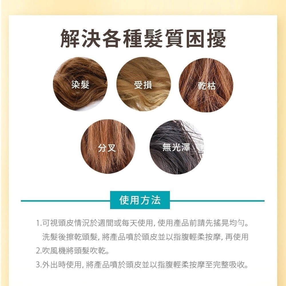 3.外出時使用,將產品噴於頭皮並以指腹輕柔按摩至完整吸收。