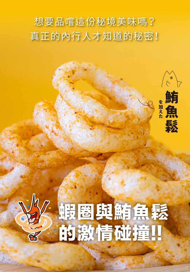 .蝦圈與鮪魚鬆的結合 .每一口都吃得到蝦的鮮甜 .咖滋酥脆,越吃越刷嘴 .大包裝送禮也適宜