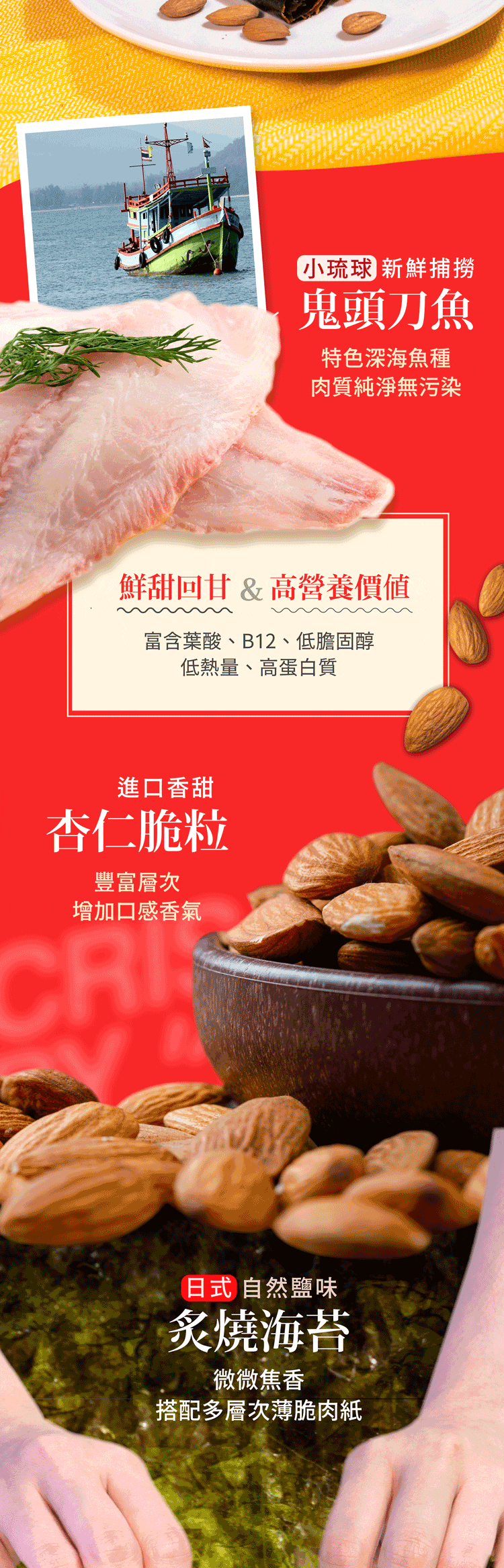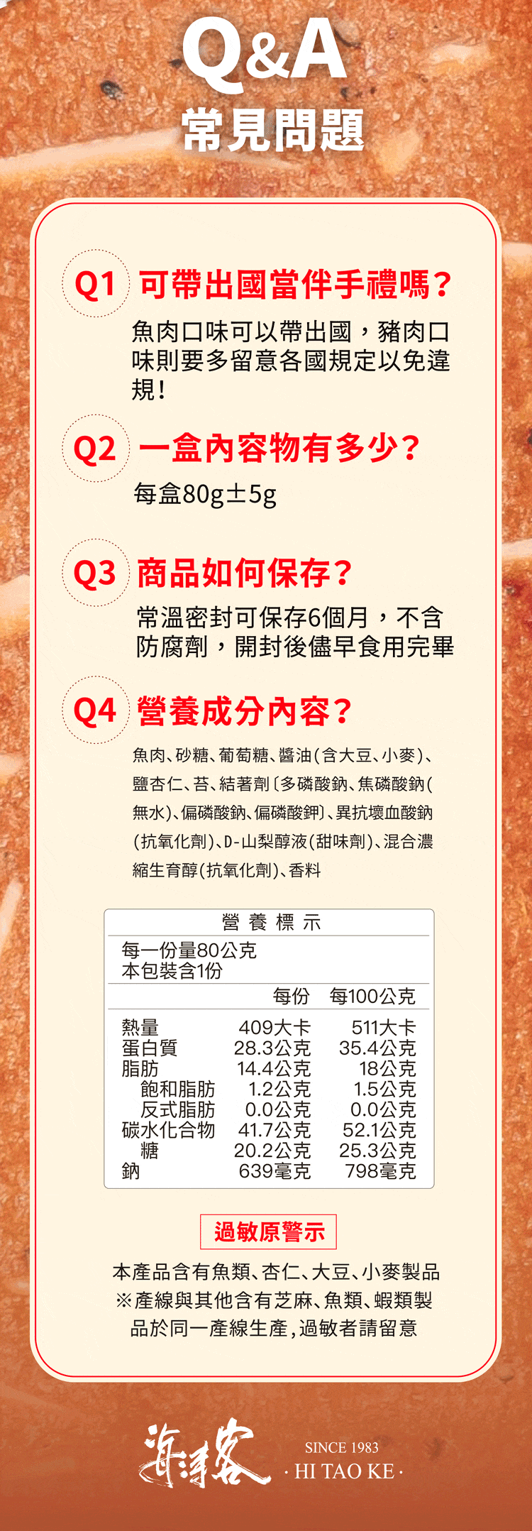 過敏原:本產品含有魚類、杏仁、大豆、小麥製品,不適合過敏體質者食用