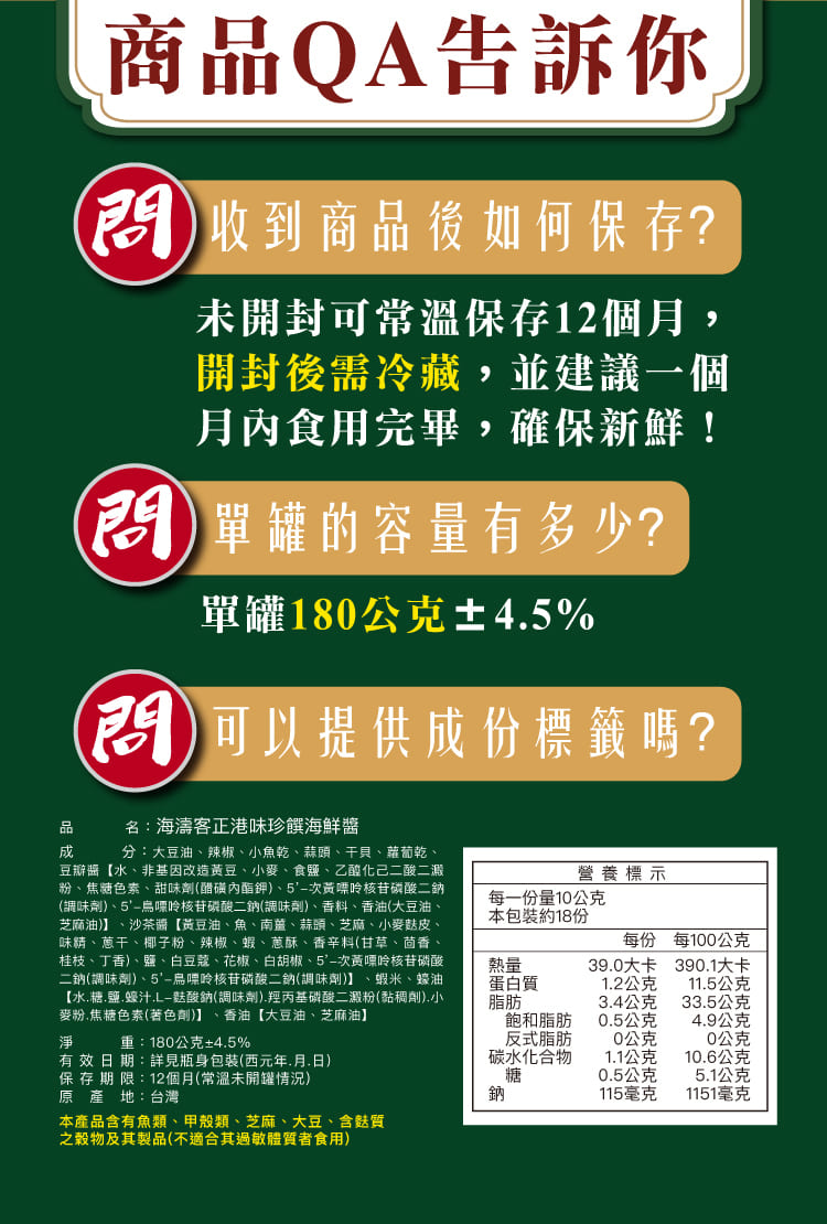 過敏原:本產品含有魚類、甲殼類、芝麻、大豆、堅果、含麩質之穀物及其製品(不適合對其過敏體質者食用)