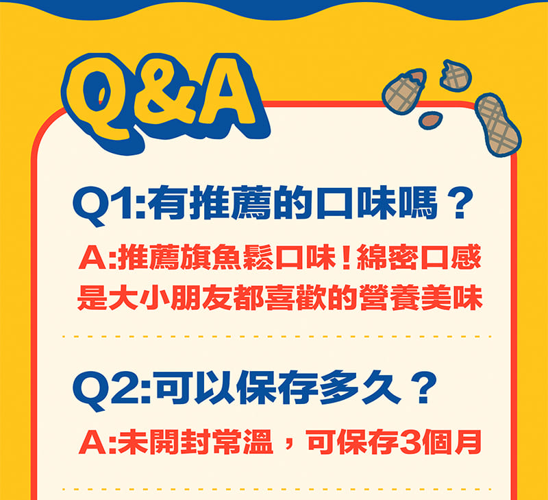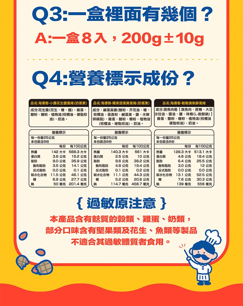 過敏原:本產品含有麩質的穀類、雞蛋、奶類、魚類、大豆其製品( 不適合對其過敏體質者食用 )