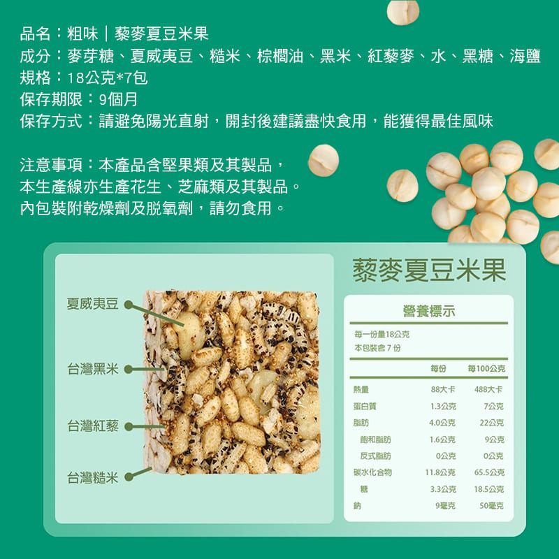 成分:麥芽糖(樹薯澱粉、水、液化酵素、糖化酵素)、核桃、棕櫚油、糙米、黑米、水、紅藜麥、黑糖、海鹽