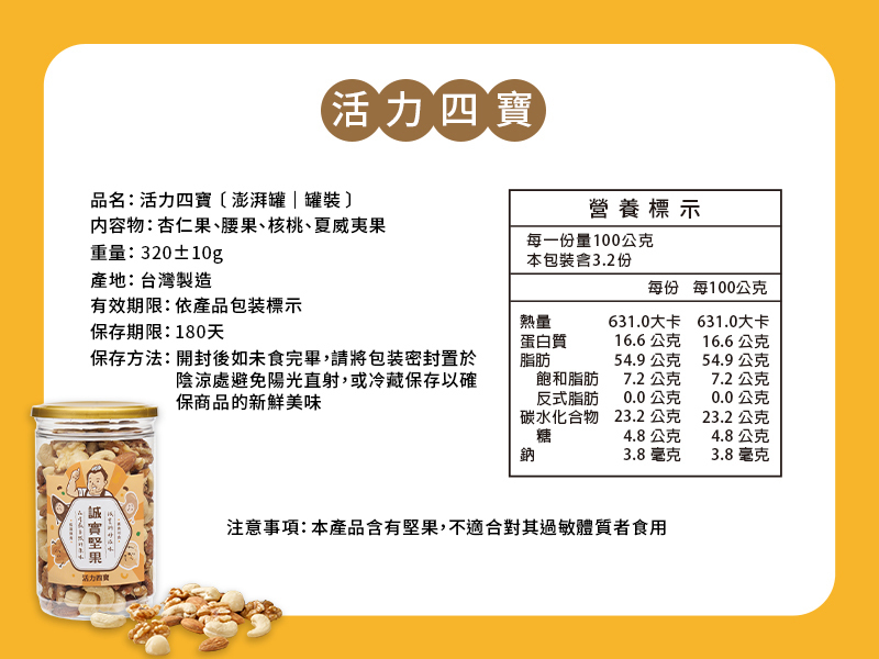 過敏原資訊:本產品含有堅果,不適合對其過敏體質者食用。