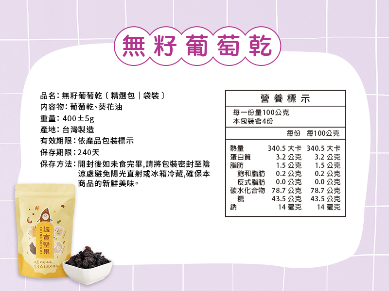 【誠實堅果】無籽葡萄乾 袋裝|純素 售價 180 元 特價 150 元