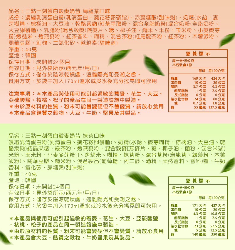 *本產品含麩質之穀物、大豆、牛奶、堅果及其製品