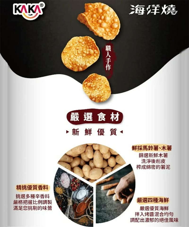 KAKA三大特色「獨門醬汁、手工醬烤、離心脫油」,讓餅乾風味更佳!KAKA獨有食品級「Deoil離心脫油」技術更讓餅乾乾燥、清爽,包裝內袋無多餘油脂殘留,讓您放心享用零食!