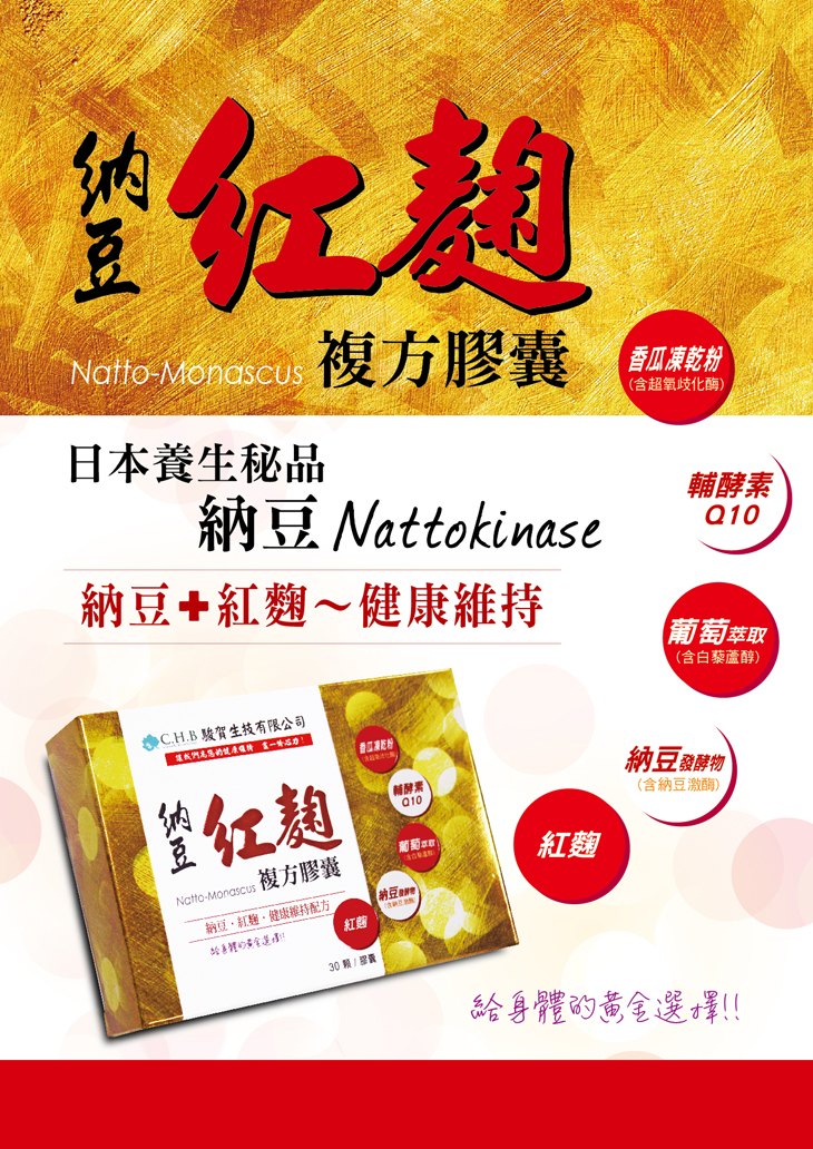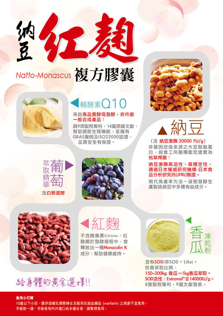 成分內容物 :紅麴丶玉米澱粉丶納豆發酵物(含納豆激酶)丶葡萄萃取丶(含白藜蘆醇)、輔酵素Q10、香瓜凍乾粉(含超氧歧化酶)