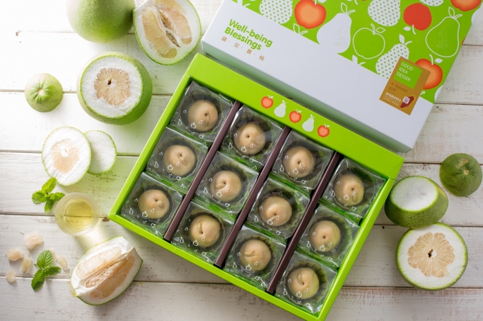 小柚餅上的綠葉不是色素, 而是日本抹茶粉製作而成.月餅口味也要玩出創意,柚子就要包進月餅裡~
