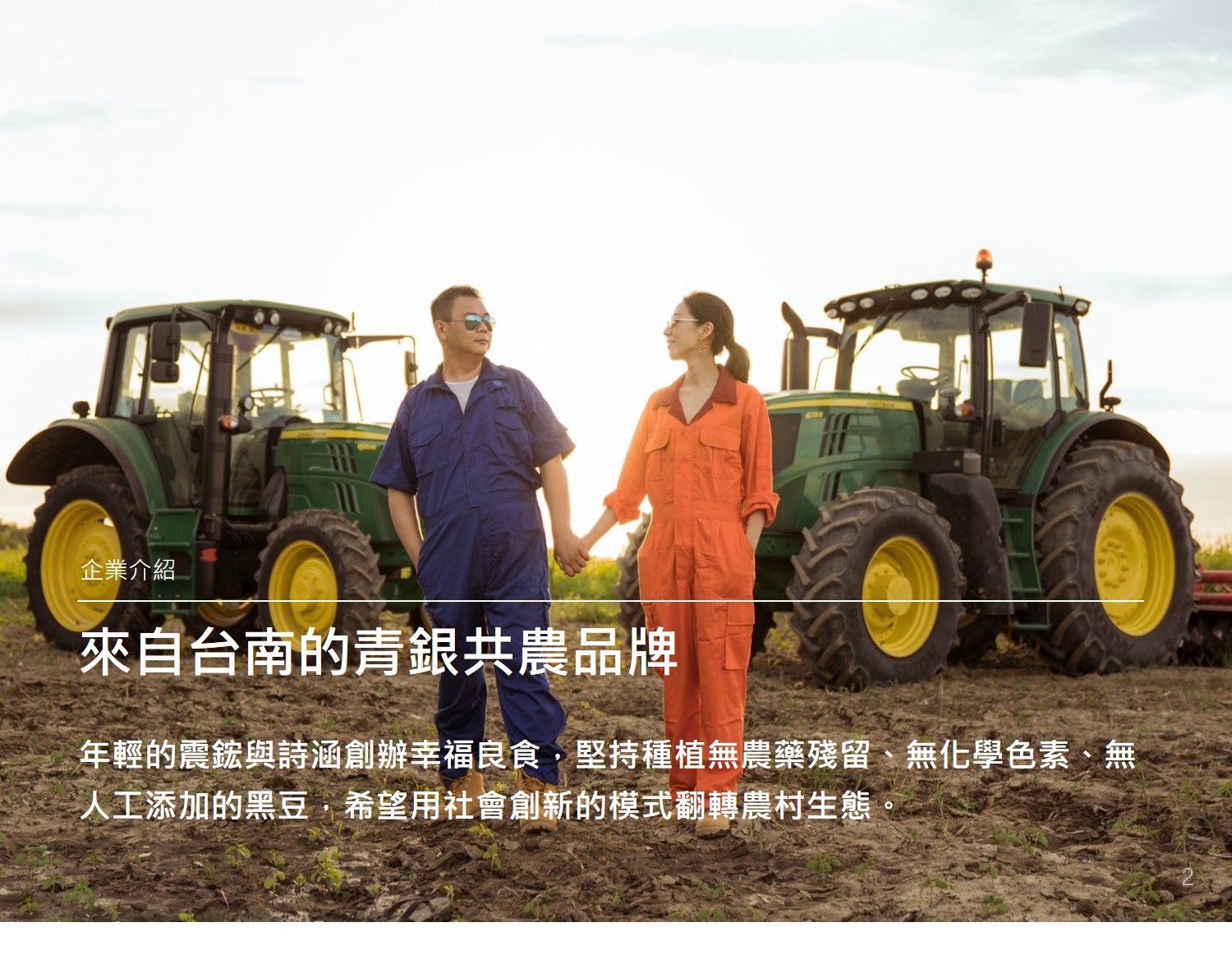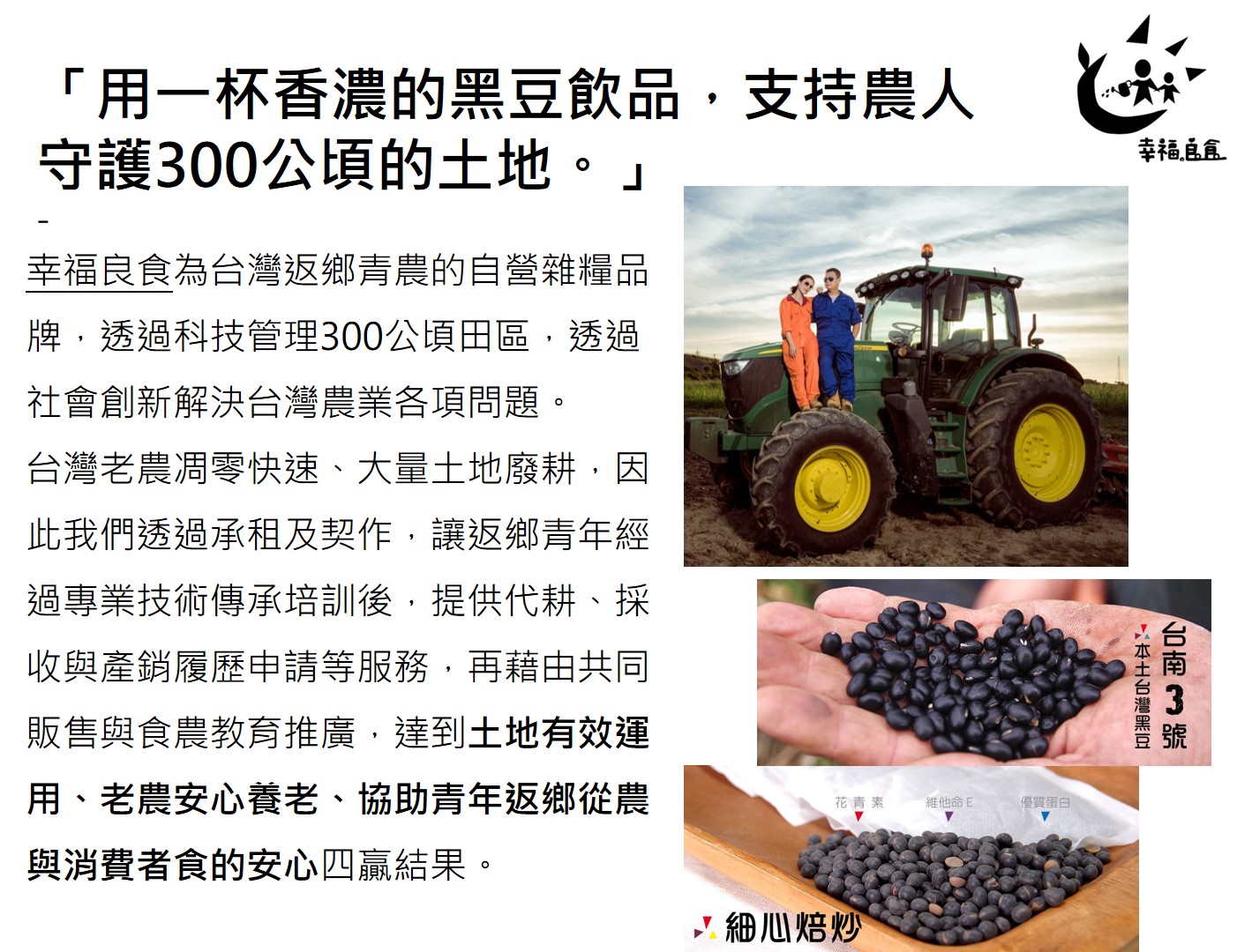 年輕的震鋐(育承)與詩涵創辦幸福良食,堅持種植無農藥殘留、無化學色素、無人工添加的黑豆,希望用社會創新的模式翻轉農村生態。