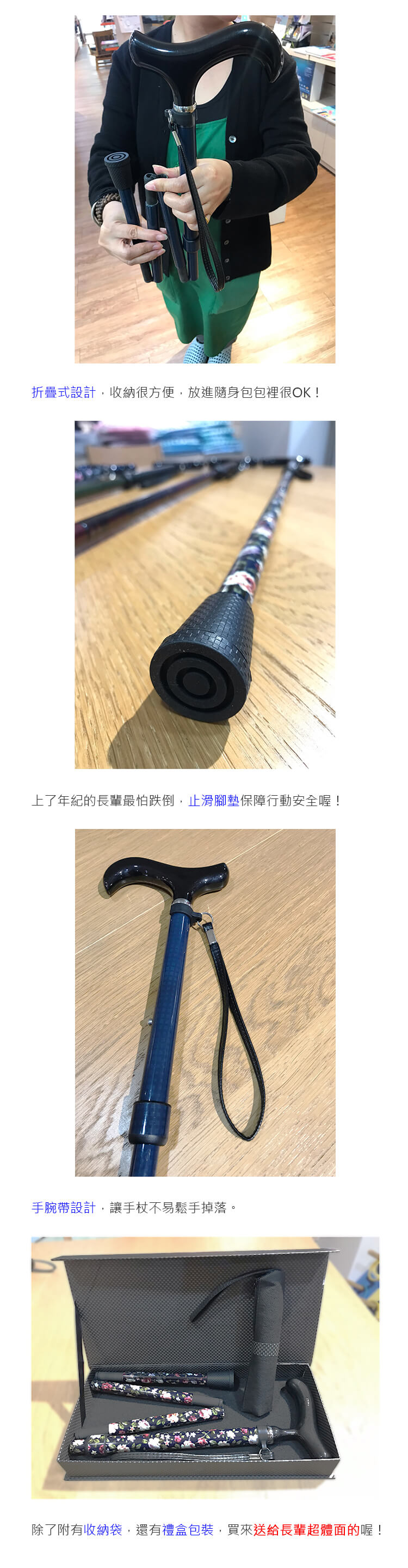 3整支表面氣染轉印花紋,各種亮眼花色,可搭配您的各種服飾,讓阿公阿嬤拿著心情都變好了。
