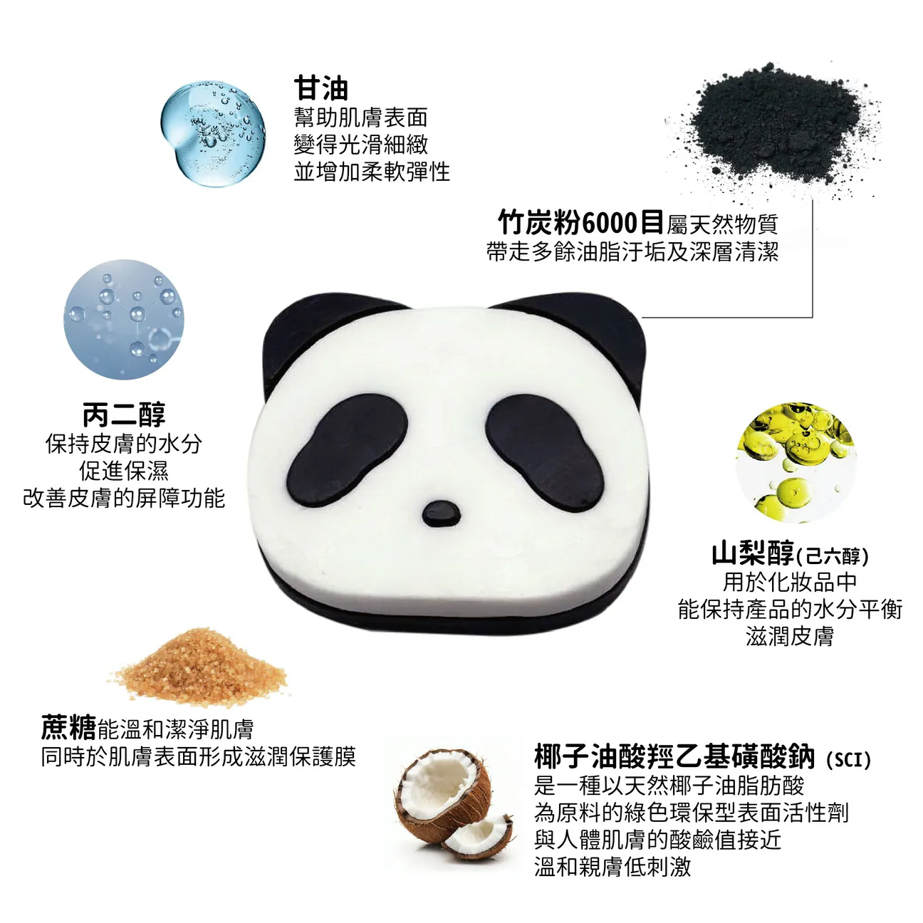 苯乙烯/丙烯酸(酯)類共聚物鈉、(日用)香精、椰油醯羥乙磺酸酯鈉、竹炭粉6000目、檸檬酸鈉、氯化鈉