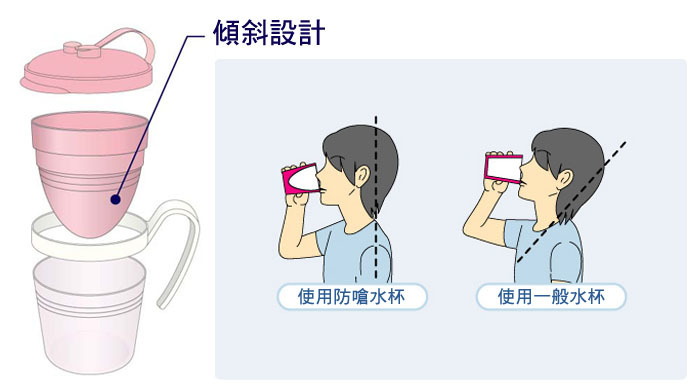 1杯子內部傾斜式設計,喝水時不用抬頭後仰,方便頭頸不易後仰者使用,也避免喝水仰頭時水從鼻子灌入。