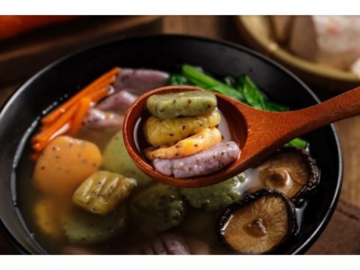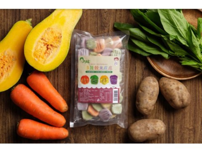 台灣米穀粉+本土多樣蔬菜(紅蘿蔔、紫地瓜、南瓜、菠菜)做出的特色米疙瘩,奇亞籽含量更高達5%,每口咬下除了米香之外還有奇亞籽口感增添風味,無麵粉、無麩質,更無額外添加食鹽,讓您吃得放心、營養滿分!