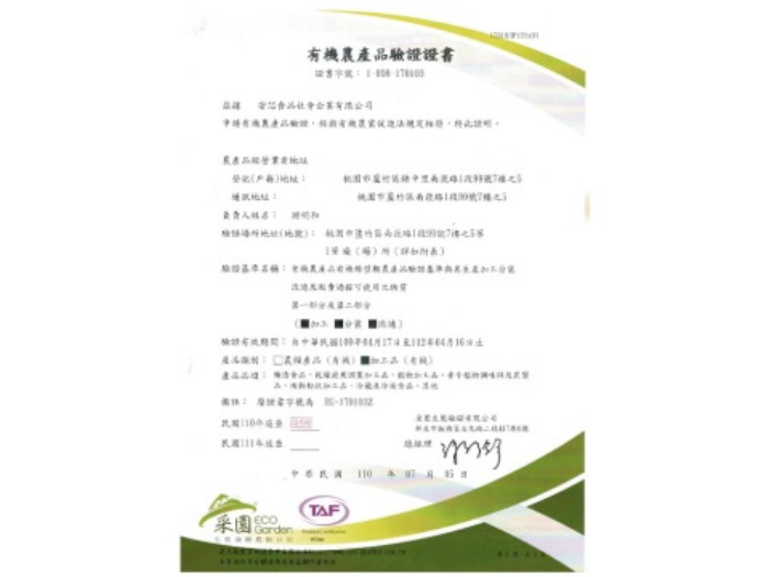 我們於106年通過有機驗證,依循法規加工食品,致力於在地有機食材、在地有機驗證。台灣有機作物受限於自然環境,導致成本高、產量不穩。如夏季三星蔥長不大,秋後蒜頭愈來愈少;有機黑豆、黃豆的價格,幾乎是進口的兩倍以上。但是選用台灣有機作物來加工,不僅蘊含友善環境、提高糧食自給率,增加就業機會的正面意義,也能提供消費者更好更健康的食品。