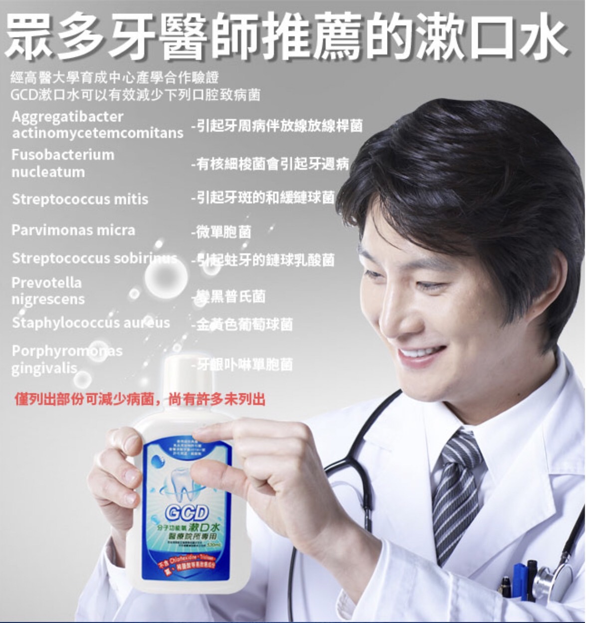 本公司與學術單位合作開發的技術,以食鹽萃取之分子功能氧,取代一般漱口水常見的chlorhexidine(氯已錠)、Triclosan(三氯沙)、稀鹽酸、氟的抗菌成分,安全溫和。
