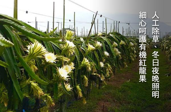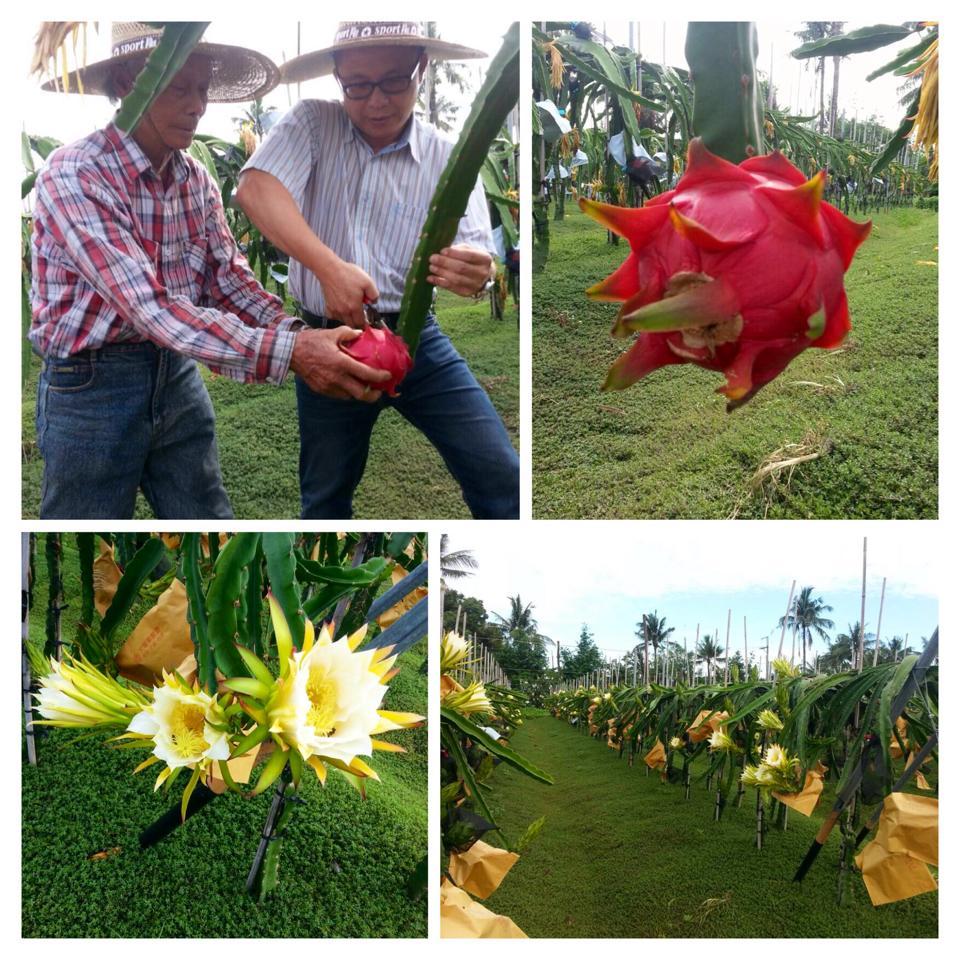 ☆鴻旗有機休閒農場的火龍果採用不需人工授粉的大紅種,為了區別不同花期結果成熟度,以不同性質的套袋來區分,第一次是黑網,第二次是紙袋,第三次是專用套袋,所以每次採收都以套袋來區分,不會混淆。紅龍果並不難種,但重視肥培管理,在地上種了四瓣馬齒莧,這種草極耐蔭而且蔓延性強,鋪蓋在地表,除能保持肥力及水份不易蒸散,但又通風性佳,遠看就像一片地毯。種紅龍果重點在修枝,紅龍果長得快,不必要的側芽及小果都要剪掉,一株紅龍果只留一顆果實,單粒約重達1台斤左右。