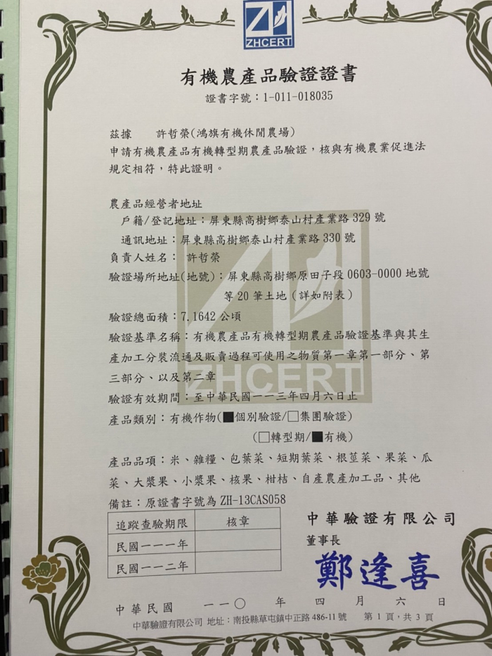 鴻旗有機休閒農場是由高雄十全國小退休的許天來老師所創立於1990年 , 位於大武山下水源保護區 , 目前佔地約15公頃 (園區內約有10公頃 ; 園區外約有5公頃) ; 鴻旗經「慈心有機農業發展基金會」與「中華有機農業協會」的認證 , 堅持以最用心的態度愛護這片土,可以讓民眾吃得很健康也很放心。