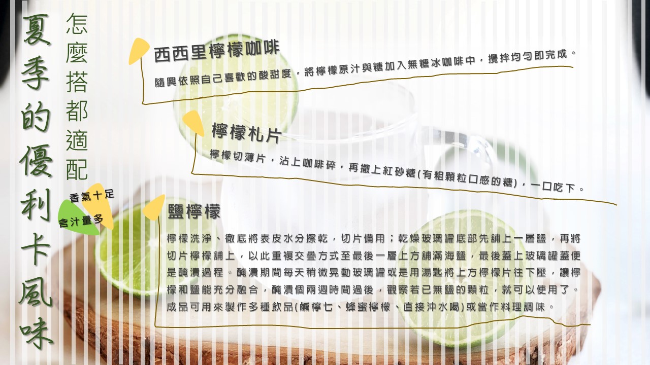 汁多、酸香濃郁,具有耐存放特性 果肉帶淡淡黃色,有些許籽粒 果皮變得較軟、酸度也會略降,呈現另一番風味 百變多用,飲品調製或是料理調味都適宜。