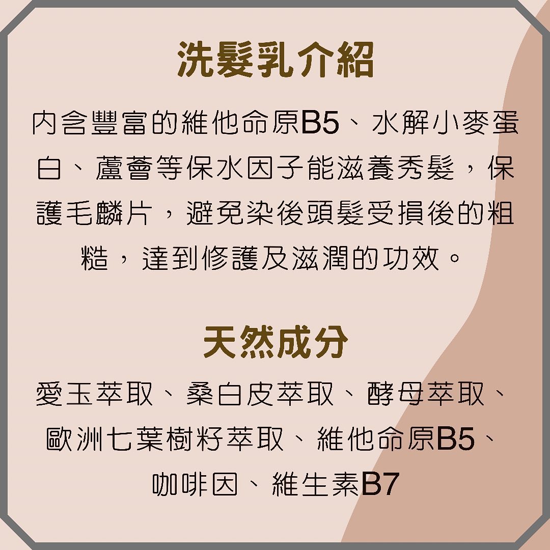 因染髮造成的營養流失.維他命原B5、水解小麥蛋白、蘆薈等保水因子能滋養秀髮·保護毛麟片.避免染後頭髮受損粗糙。