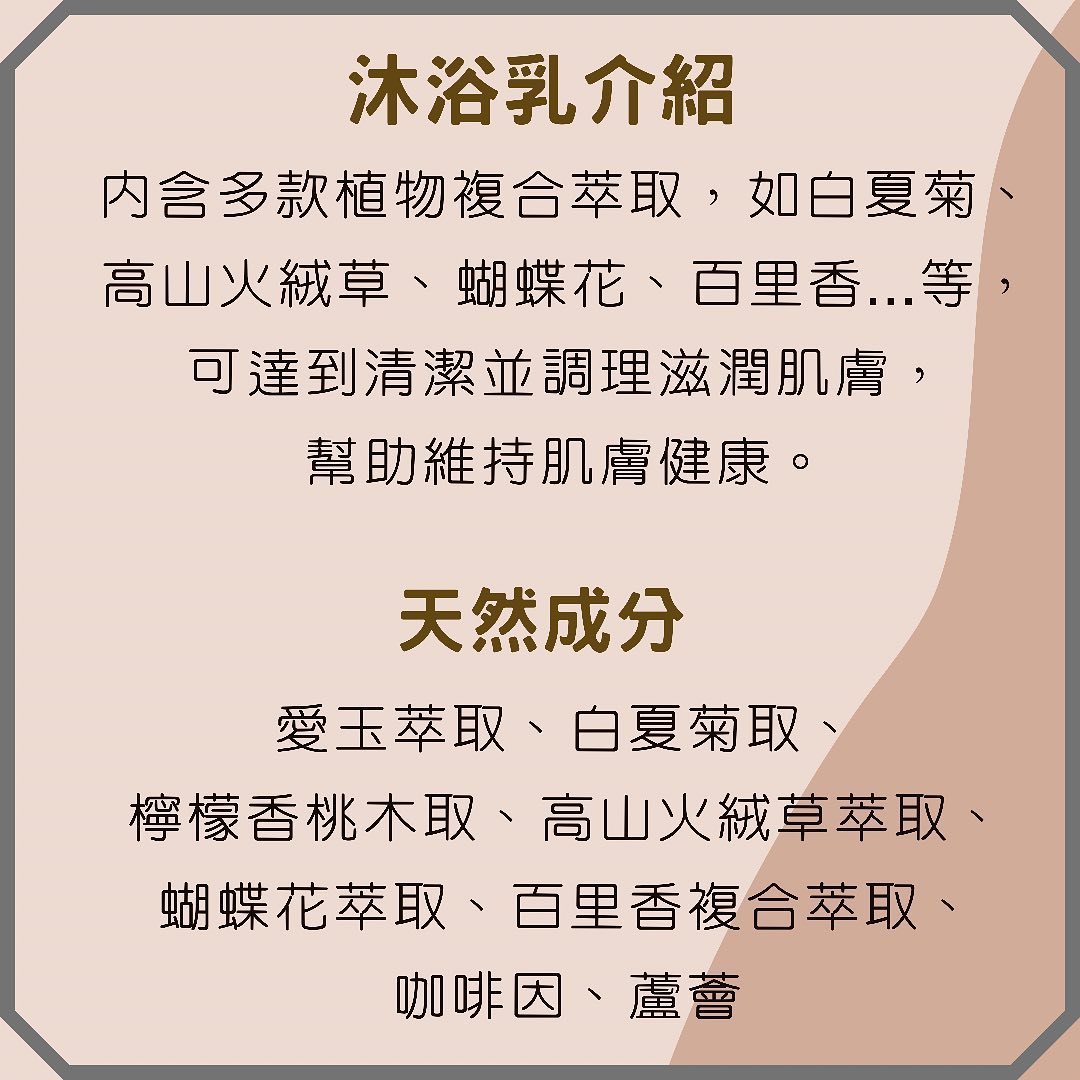 白夏菊、高山絨草、蝴蝶花、百里香等多款植物複合萃取清潔並理滋潤肌膚.幫助維持肌膚健康。
