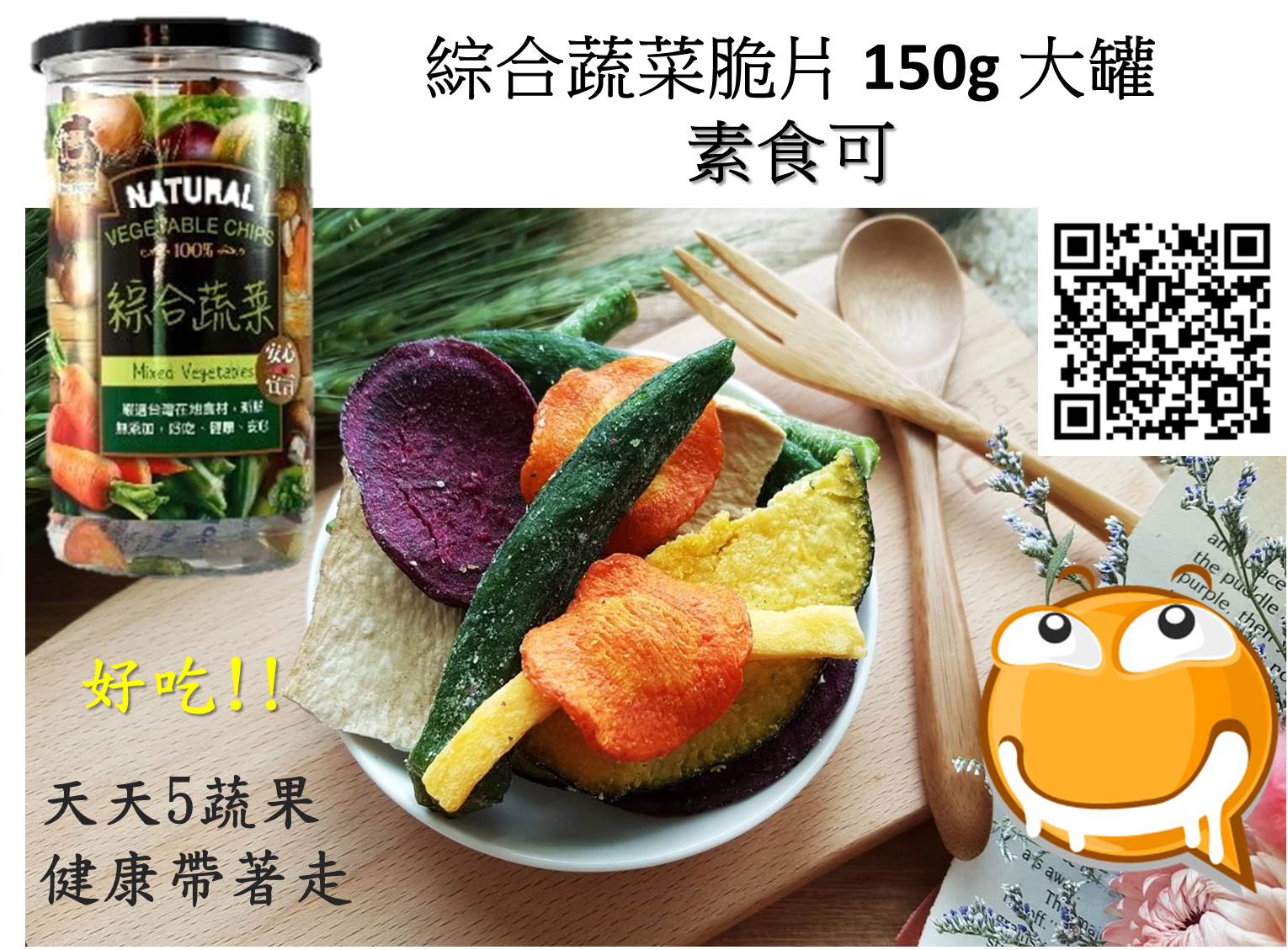 內有黃地瓜脆條、紫地瓜脆片、紅蘿蔔脆片、菇脆片、秋葵脆片、敏豆脆片、南瓜脆片,