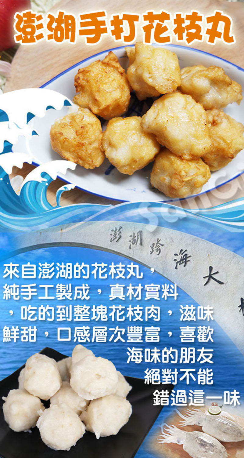 - 選用新鮮花枝及上等魚漿製成,顆顆紮實飽滿