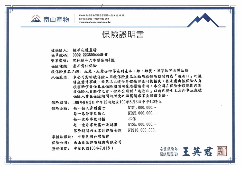 已於[南山產物]投保[1000萬產品責任險] ,保單號碼:0900-223304