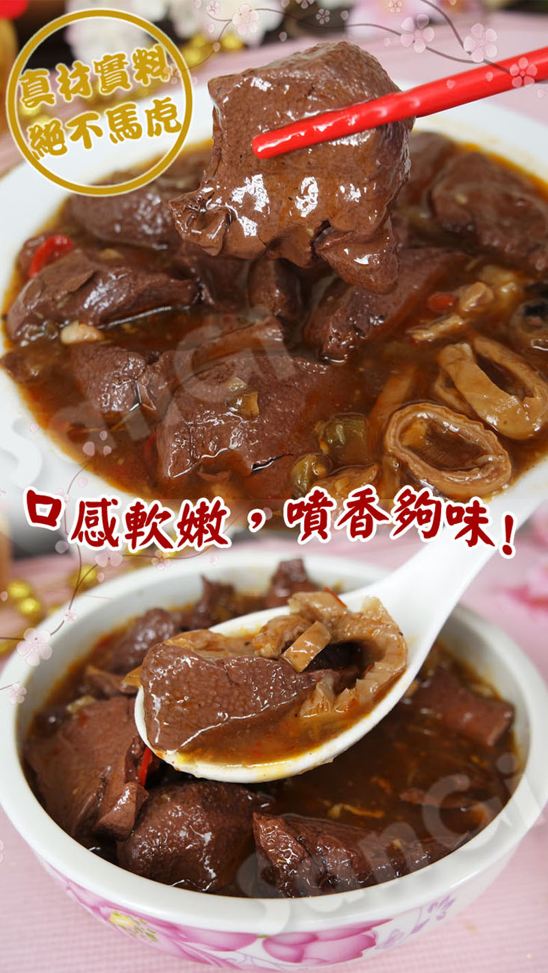 主要成分:水、禽血【水、雞血、鴨血、鹽】、豬大腸頭、豬肉、辣豆瓣醬、大豆油、酸菜(酸菜、鹽、水、無水氯化鈣)、香菇、辣椒油(沙拉油、辣椒粉、天然辣椒萃取物、天然辣椒紅色素) 、蠔油、麻辣鍋醬、乙醯化己二酸二澱粉、辣椒、蒜仁、醬油、砂糖、蒜苗、米酒、薑、鮮雞風味粉食鹽、花椒粒、白胡椒粉