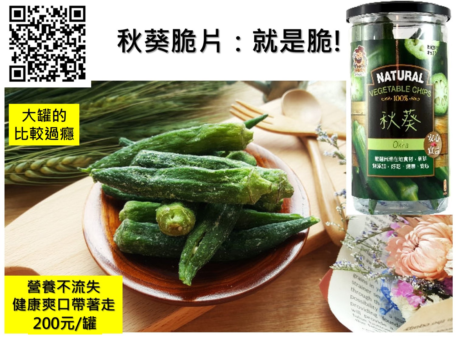 百分百的用心,將秋葵的清香及完整保留,吃起來酥脆像餅乾,完全沒有煮熟後的黏稠感~非常適合害怕秋葵口感的族群食用!酥脆爽口的美味,好評上市!完全不添加防腐劑與人工色素,滿嘴的香氣、超脆口,顛覆傳統果乾想法,保證讓你愛不釋手!