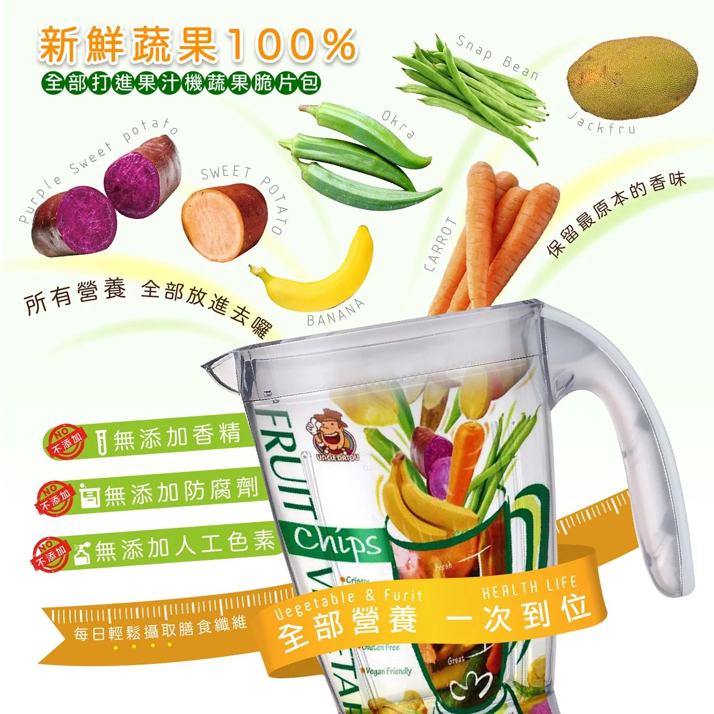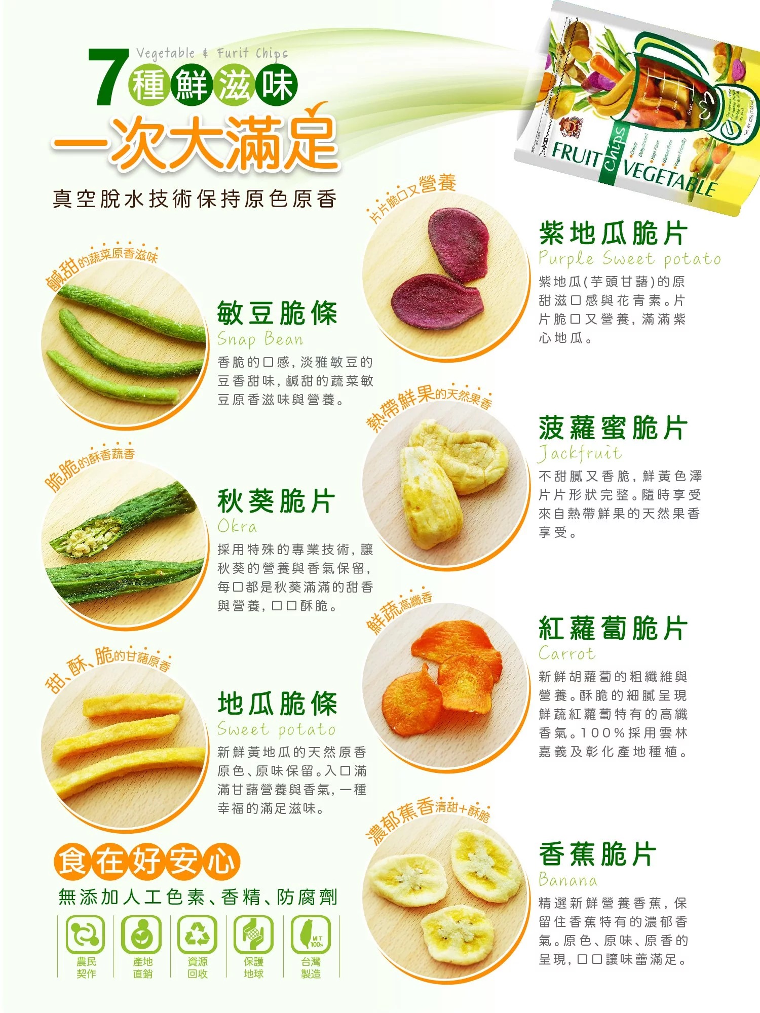 內容有:香蕉脆片、紅蘿蔔脆片、黃地瓜脆片、紫地瓜脆片、菠蘿蜜脆片、秋葵脆片、敏豆脆片。