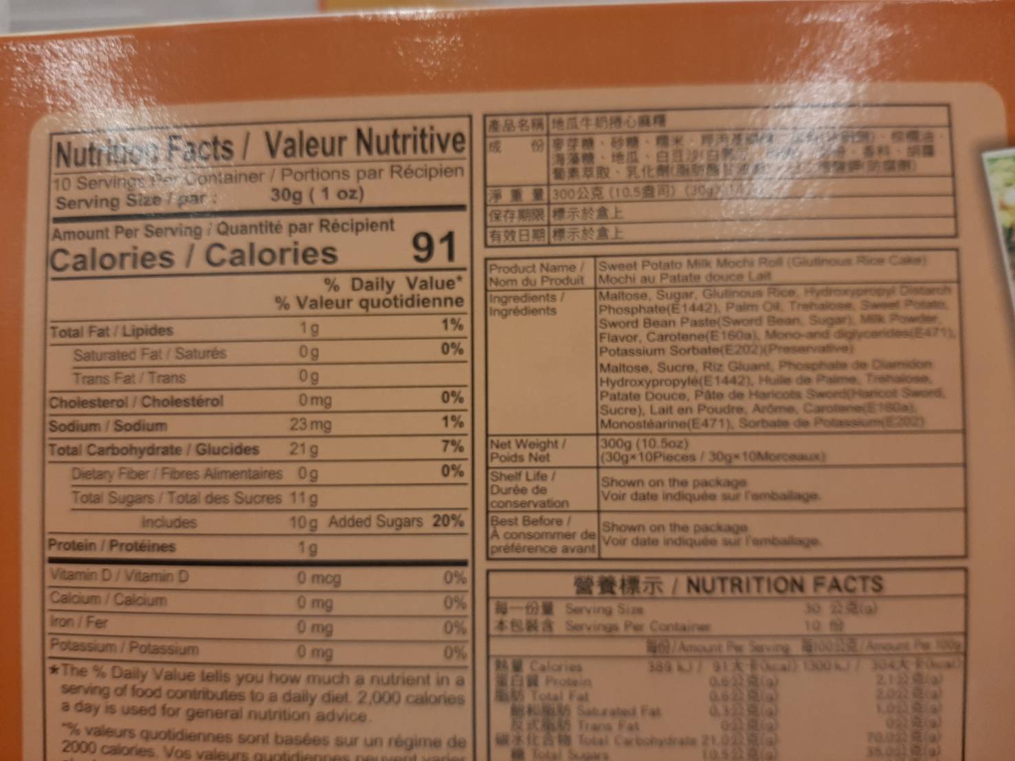 麥芽糖、砂糖、糯米、羥丙基磷酸二澱粉(粘稠劑)、棕櫚油、海藻糖、地瓜、白豆沙(白鳳豆、砂糖)、奶粉、香料、胡蘿蔔素萃取、乳化劑(脂肪酸甘油酯)、己二烯酸鉀(防腐劑)