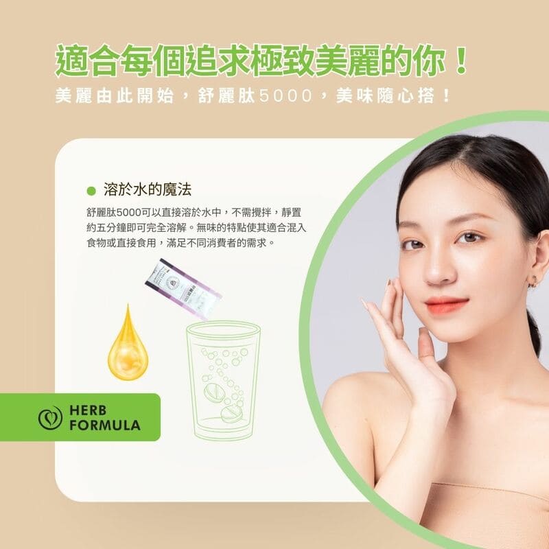 溶於水的魔法,不需攪拌,美麗由此開始,舒麗肽5000,美味隨心搭!
