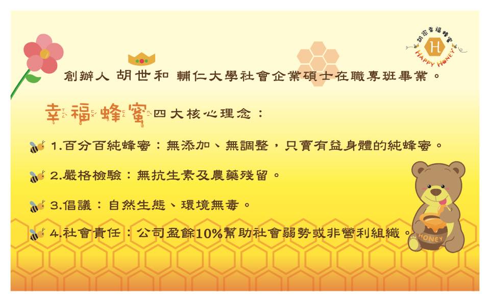 創辦人胡世和輔仁大學社會企業碩士專班畢業,2016年因參加輔大國際社會服務,而接觸到養蜂技術,因氣候變遷加上中囊病毒害與農藥濫用,蜜蜂數量銳減,間接影響蜂蜜產量,市場充斥「添加糖蜂蜜」,但是無謂的添加,只會造成食安疑慮與身體負擔,加上蜂農蜂蜜銷售通路有限,創辦人本懷社會創業精神,創立「胡家幸福蜂蜜」為蜂農代銷蜂蜜、為消費者嚴選百分百純蜂蜜。