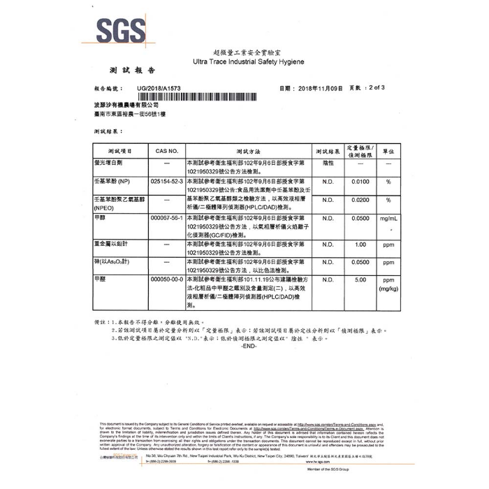 產品通過SGS檢驗,對於三氯沙、壬基苯酚、壬基苯酚聚乙氧基醇、甲醛、全磷酸鹽及八大重金屬檢驗(砷,鉛,汞,鎘,銻,鋇,鉻,鎳)等危險物質零檢出