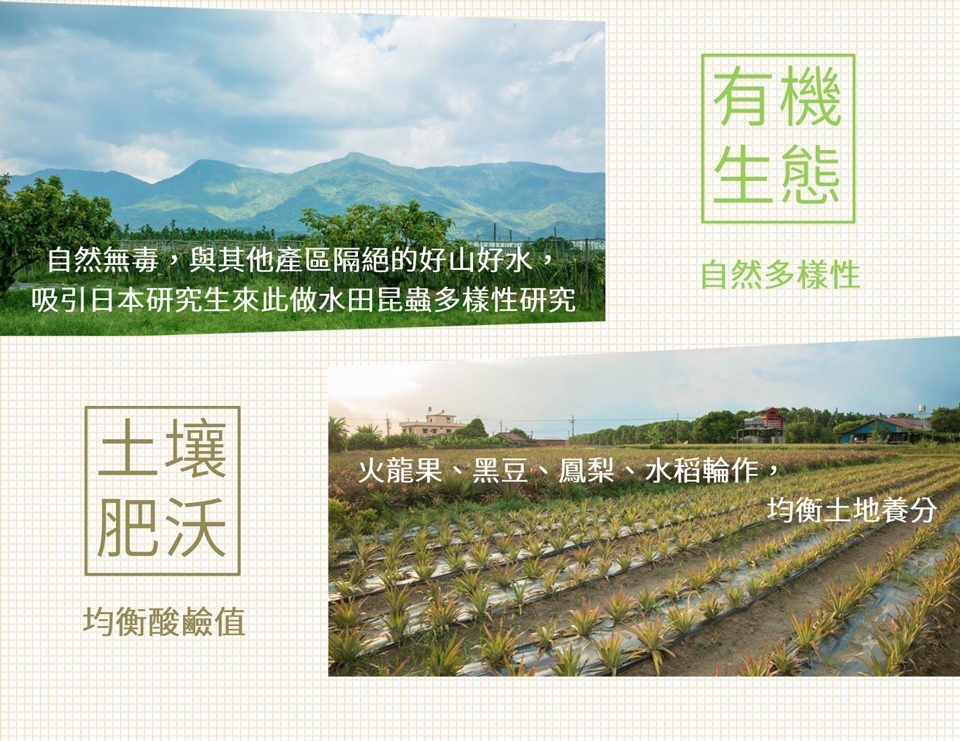 鴻旗有機休閒農場佔地約十五公頃,產出的農產品包括:鳳梨、紅龍果、黑豆、稻鴨米、鳳梨乾、鳳梨酵素等優質產品。